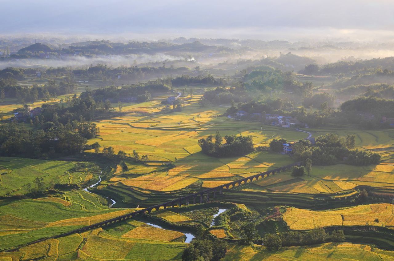 明達鎮(zhèn)紅壩村廣袤田野間翻滾千重稻浪,滿目金黃,豐收在望